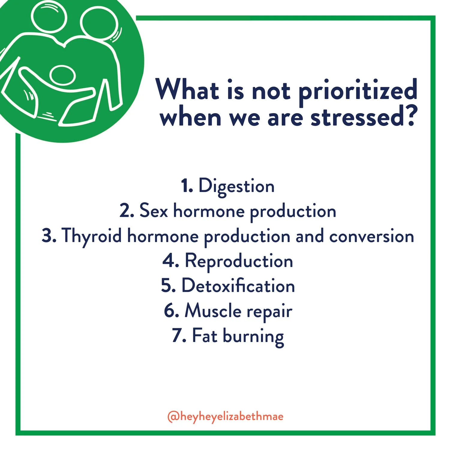 The thing with stress is it comes in SO. MANY. FORMS. Stressors can be internal, external, mental, physical, and emotional. Our bodies do not discriminate or behave differently to different stressors. The response is the same. When we are stressed our body kicks into fight-or-flight mode with the number one priority being survival. This is great and super helpful when, say, we are running for our lives from a bear. Not so helpful when our stress is from blood sugar dysregulation because we were too busy to eat breakfast.