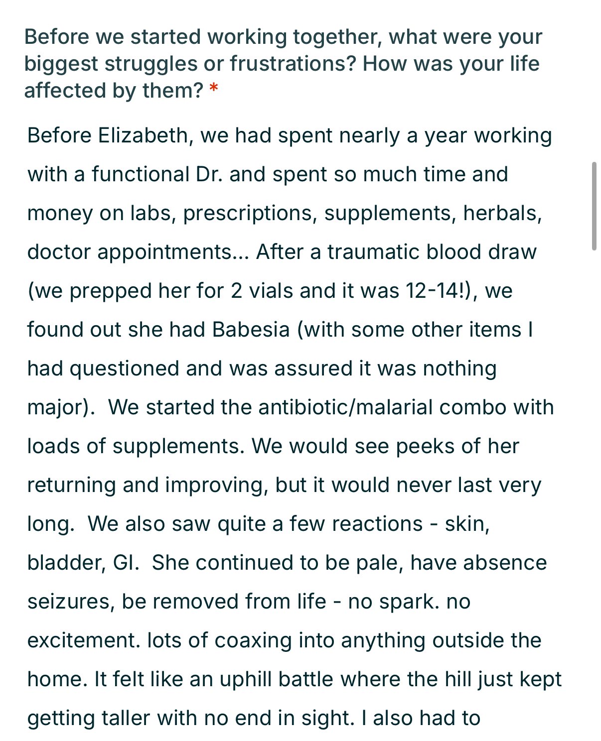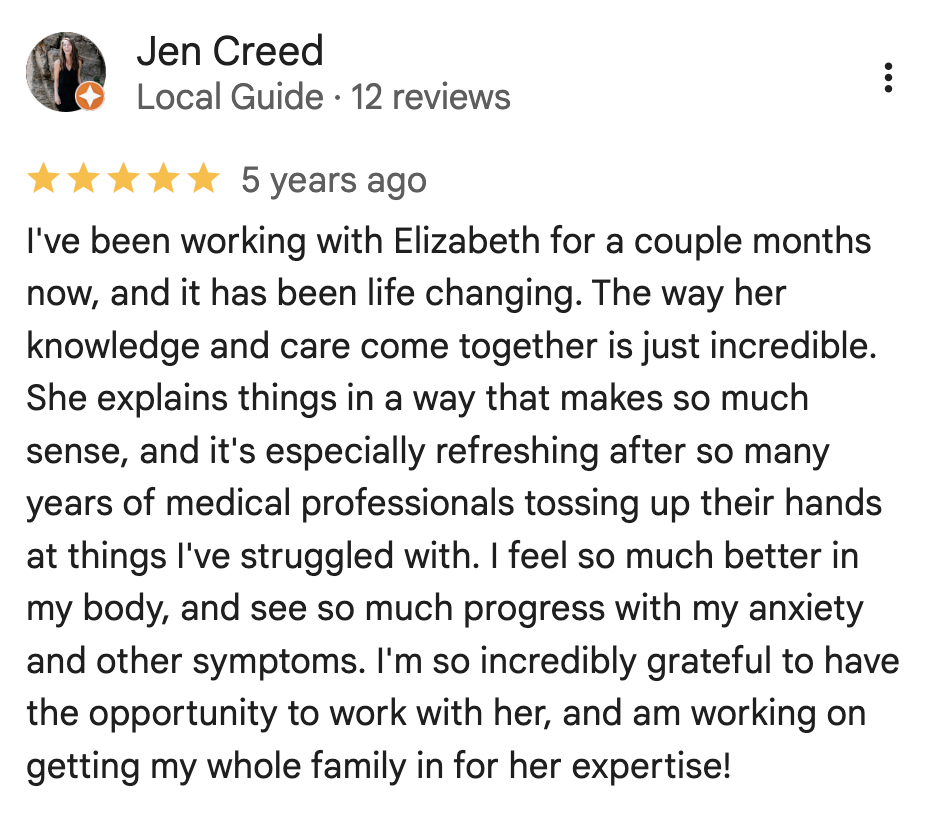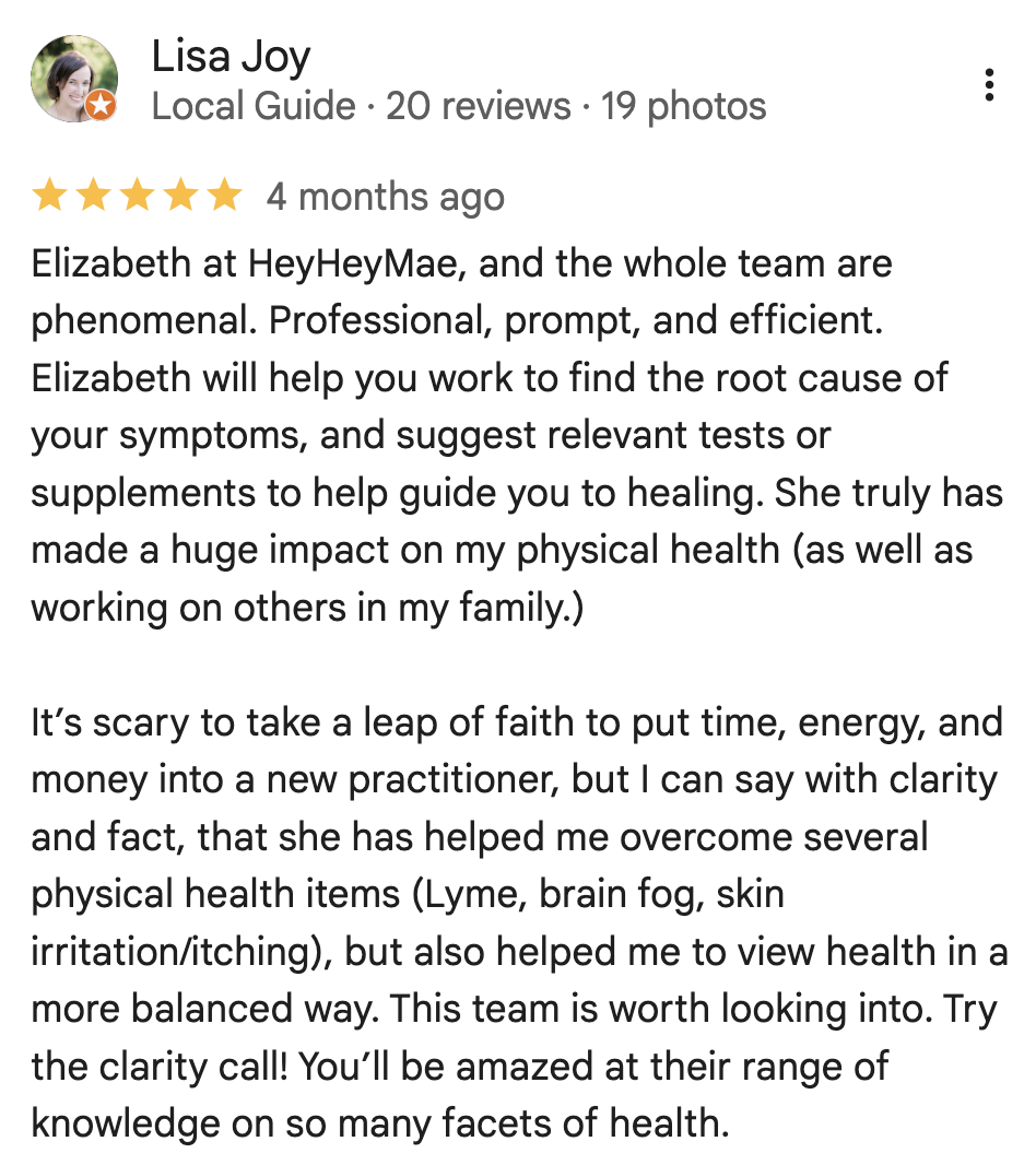 knows what you're talking about!I I (Elizabeth) learned early in my health journey that a functional test is only as good as its reviewer. Our proven process and miles of happy clients are our proof of success. We spend the time, we comb through research, we update testing methods, we work tirelessly to get to the true root of your illness.