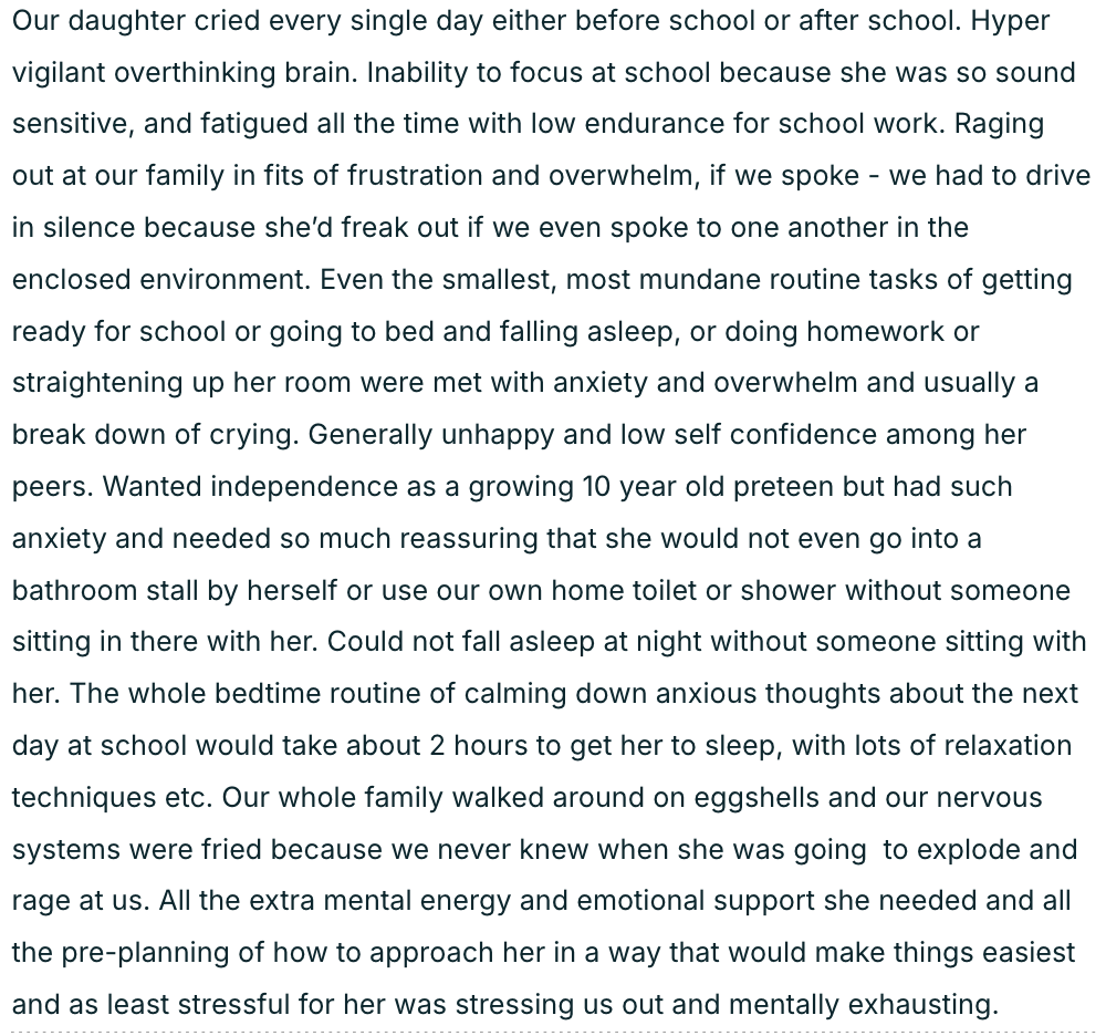 Many parents tell us they’ve been dismissed, told this is “just anxiety,” or given tools that manage symptoms without addressing why they started. Others have tried antibiotics, supplements, therapy, immunosuppressants or medications - sometimes with partial or temporary relief.