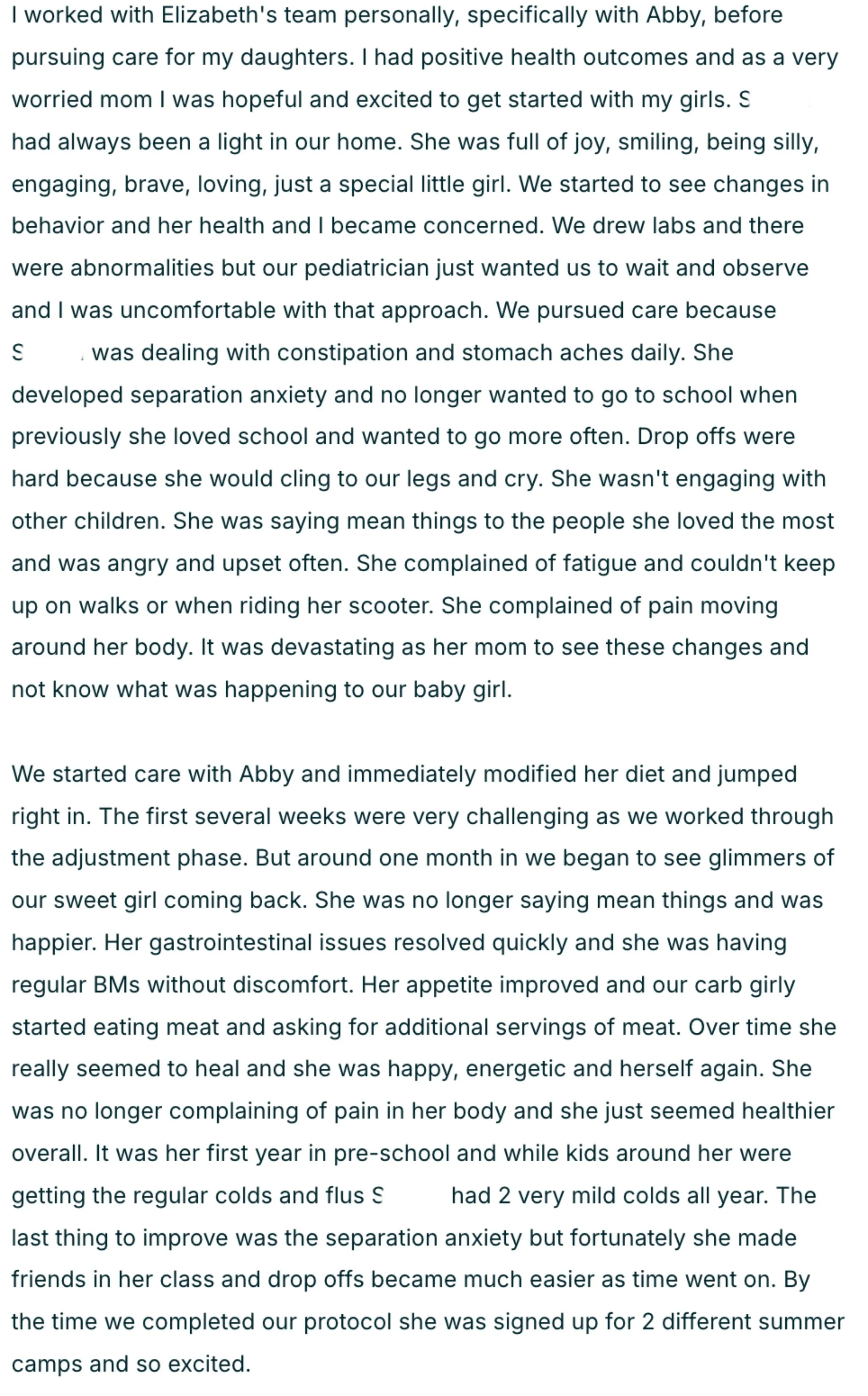knows what you're talking about!I I (Elizabeth) learned early in my health journey that a functional test is only as good as its reviewer. Our proven process and miles of happy clients are our proof of success. We spend the time, we comb through research, we update testing methods, we work tirelessly to get to the true root of your illness.